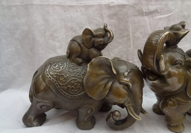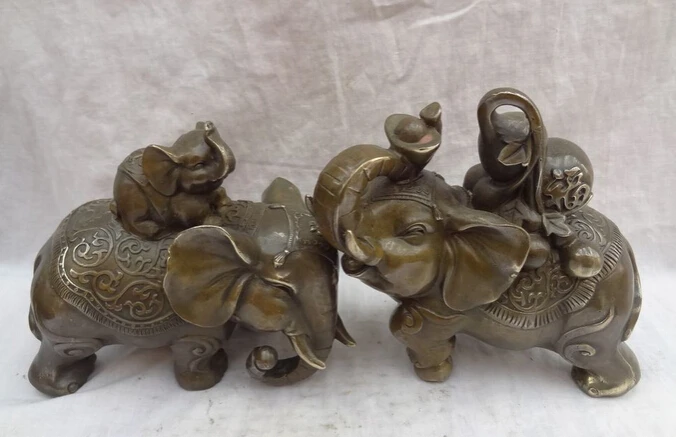 BEST JP S0271 8" Folk China Bronze Copper Wealth YuanBao Gourd Fu Elephant Family Statue Pair (B0413)